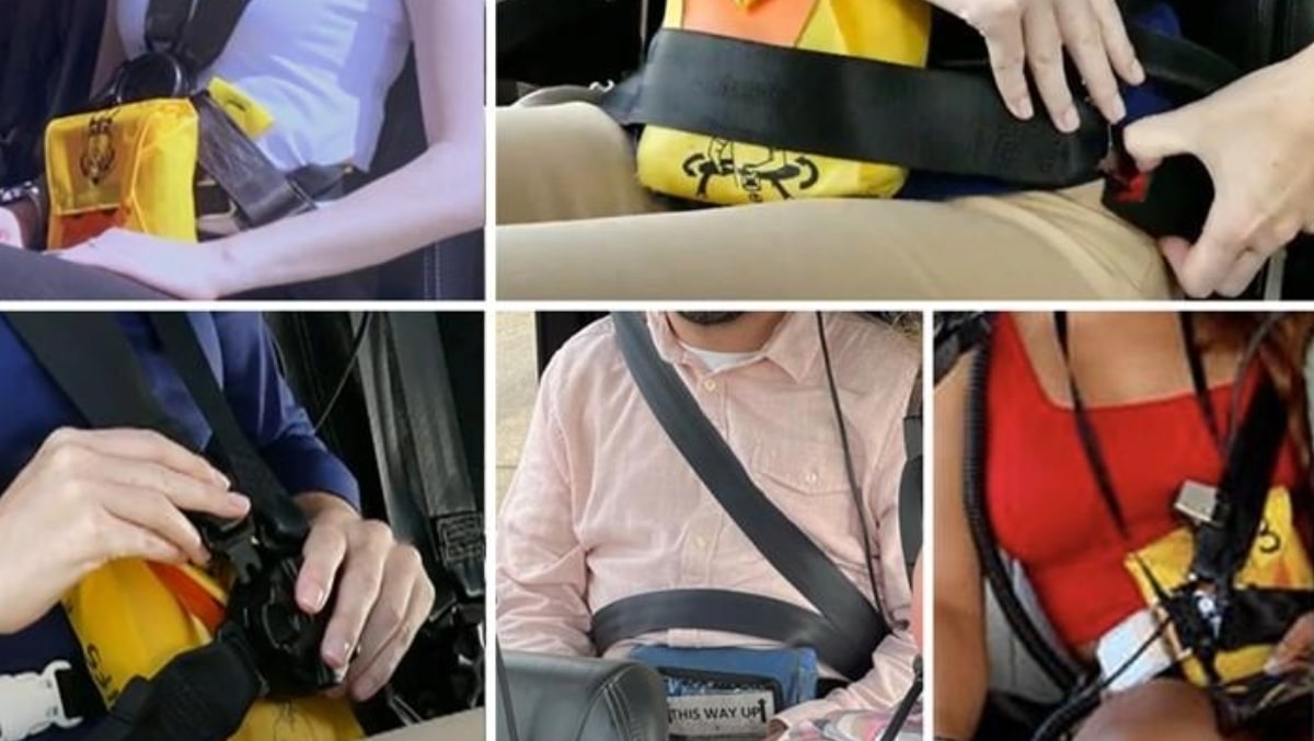 The ATSB has combed social media photos (as seen above) and identified many occasions where seatbelt webbing or buckles were worn above or over the lifejacket pouches, meaning the lap belts were slack over the pouches or too near the passengers’ sternums instead of low and tight over the hips.